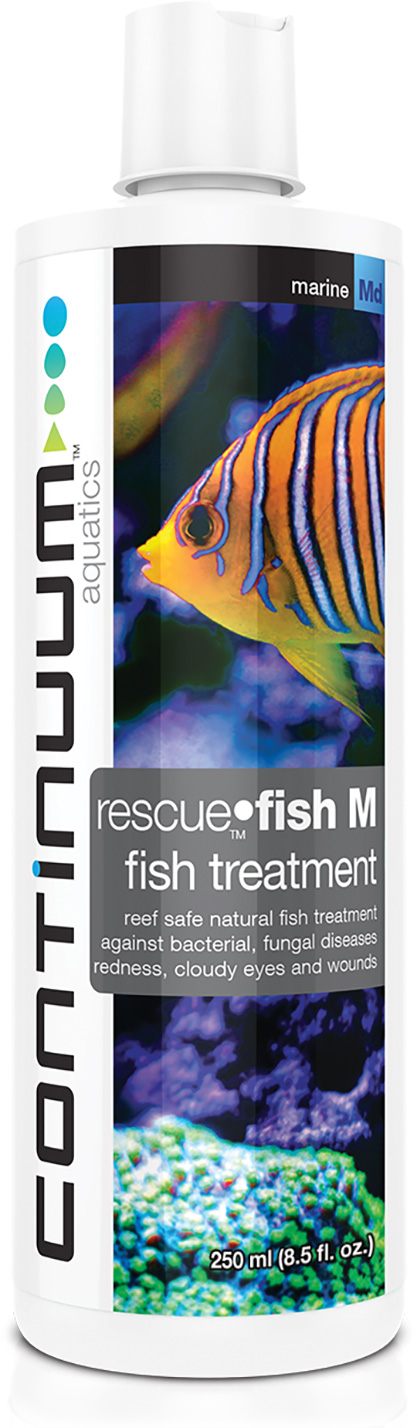 Highly effective Rescue•Fish M is designed to treat bacterial infections, open sores, ulcerations, redness in fins or body, tail and fin rot and cloudy eyes directly in the aquarium, without damaging the biological filter bacteria. It boosts the immune system of fish and helps them resist pathogens. It will accelerate skin & tissue recovery after wounds, cuts or infections. It is safe for all species of marine fish including sharks, rays eels, and seahorses and all invertebrates including soft and stony corals, anemones, mushrooms and zoas.